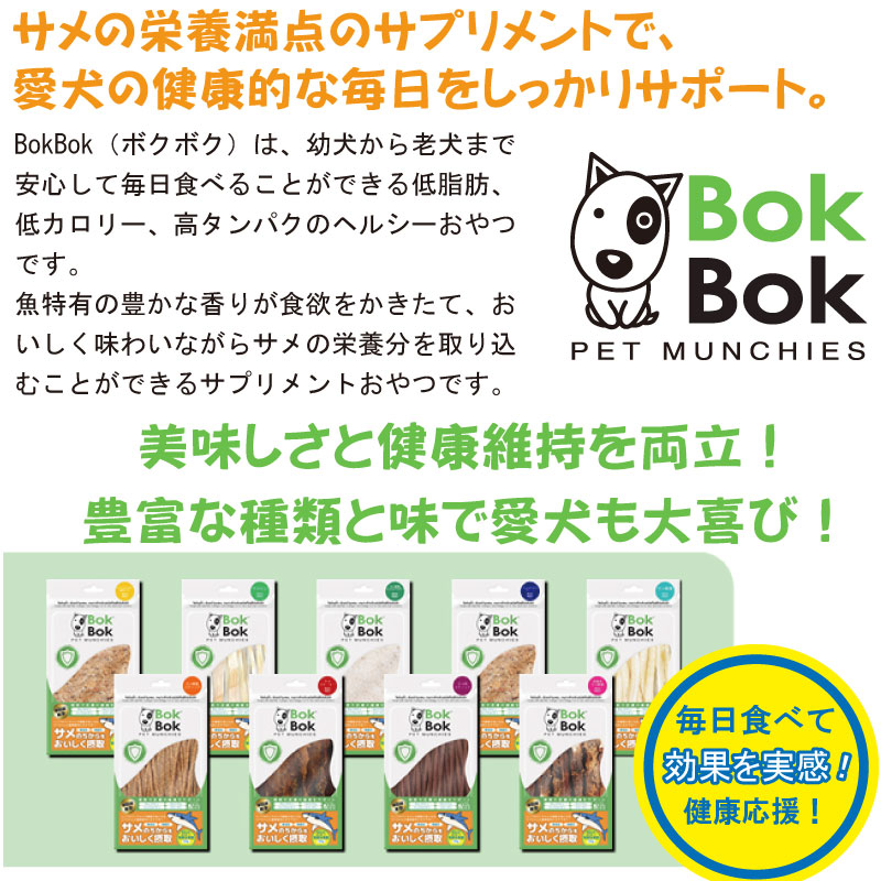 BokBok(ボクボク)は、幼犬から老犬まで安心して毎日食べることができる低カロリー、低脂肪、高タンパクのヘルシーなおやつです。