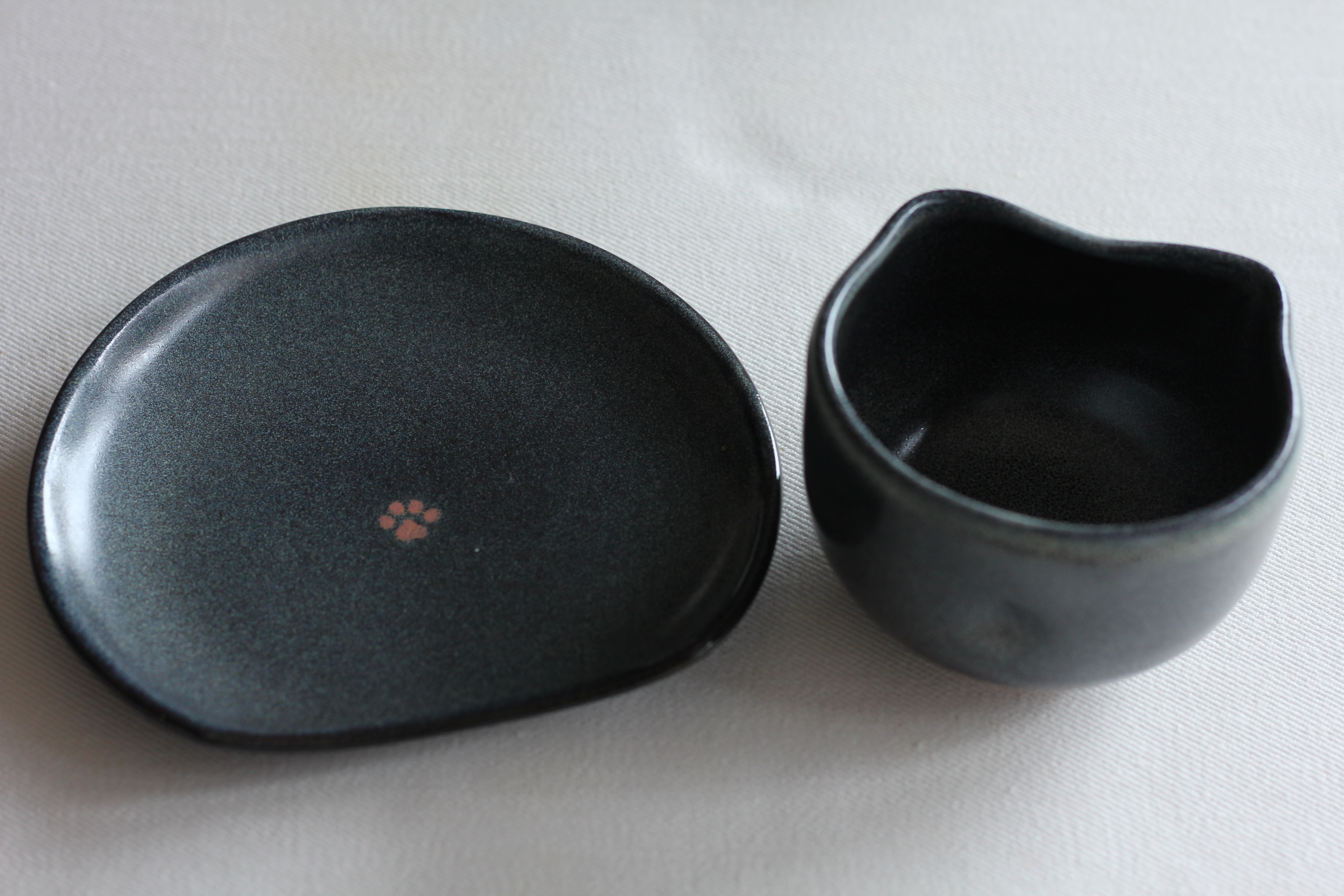 お湯呑が猫の顔、お皿が猫の形になったセットです。