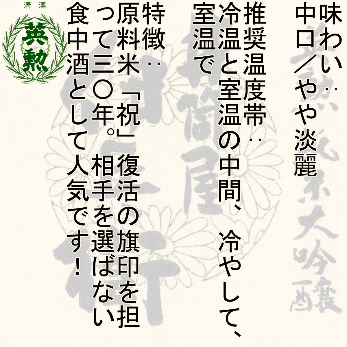原料米・祝を40%まで精米して醸した、ふくらみのある豊かな味わいとフルーティーな吟醸香が特徴の「京都の」純米大吟醸酒です。また「2010年春季 全日本酒類コンクール・純米吟醸 純米大吟醸の部(全日本国際酒類振興会主催)」での第一位獲得、「インターナショナルサケチャレンジ」2007、2008での2年連続シルバー受賞、「インターナショナルワインチャレンジ」2022での入賞など、日本酒品評会においても高い評価をいただいております。