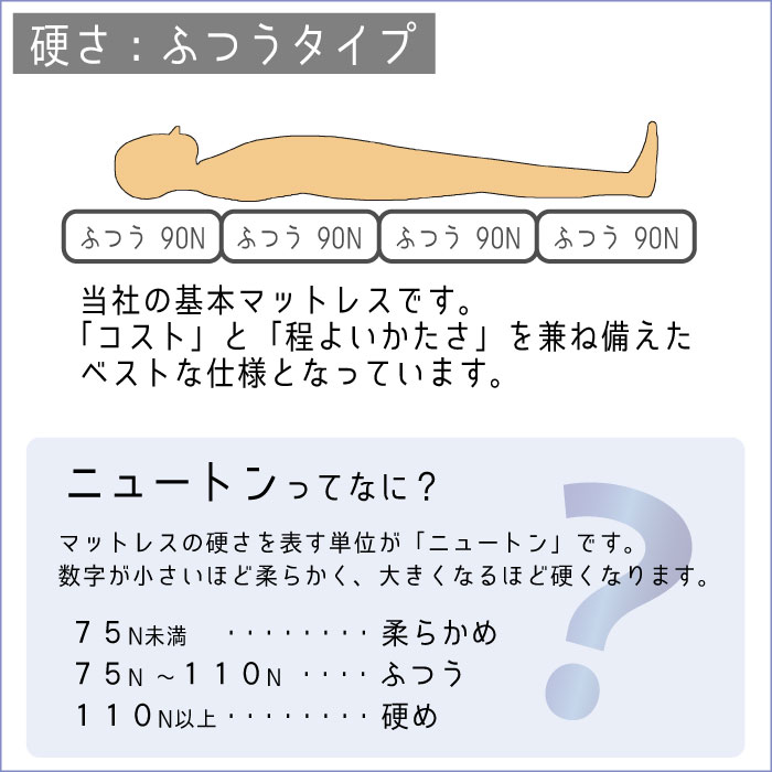 当社の基本マットレスです。「コスト」と「程よいかたさ」を兼ね備えたベストな仕様となっています。
