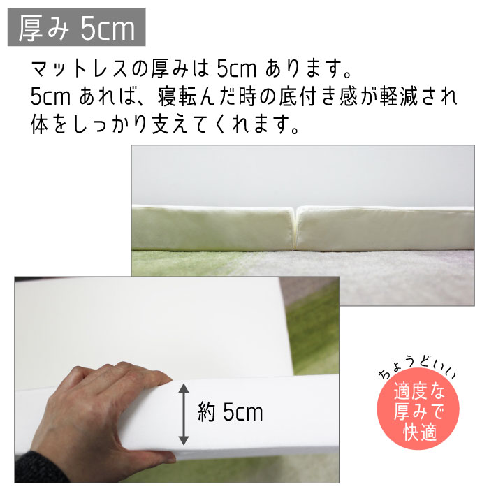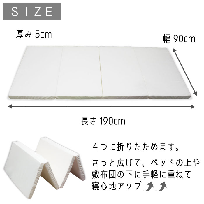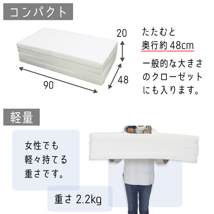 敷き布団の下やベッドマットレスの上に。お使いのアイテムにプラスして寝心地がアップします。厚みが約5cmあるので底付き感が軽減され体をしっかり支えてくれます。たたむと奥行約48cmとコンパクトになるので、クローゼットの奥行にも入ります。軽量(約2.2kg)で持ち運びも簡単です。