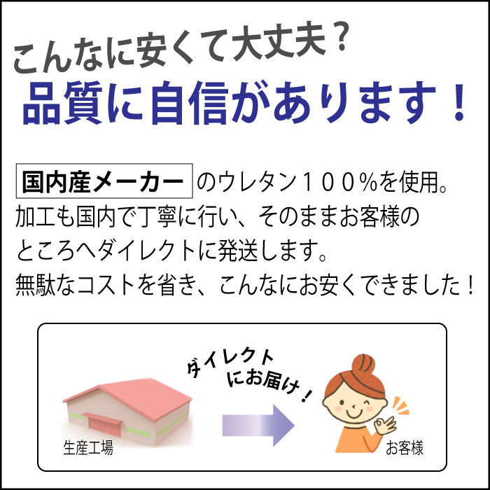品質に自信があります!国内有名メーカー製のウレタン100%を使用。加工も国内で丁寧に行い、そのままお客様のところへダイレクトに発送します。無駄なコストを省き、こんなにお安くできました!
