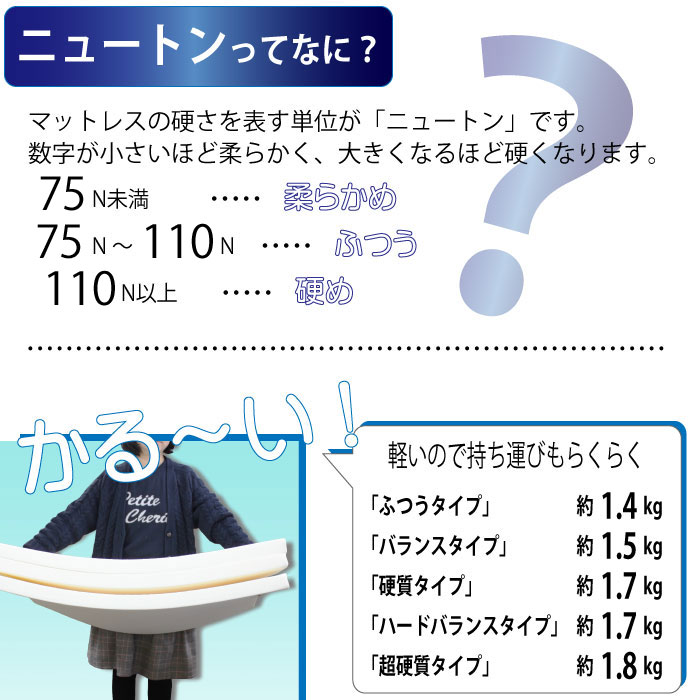 他にも「ふつうタイプ」「バランスタイプ」「ハードバランスタイプ」「超硬質タイプ」があります。お好みの硬さを選んで毎日の睡眠を良質なものに・・・。