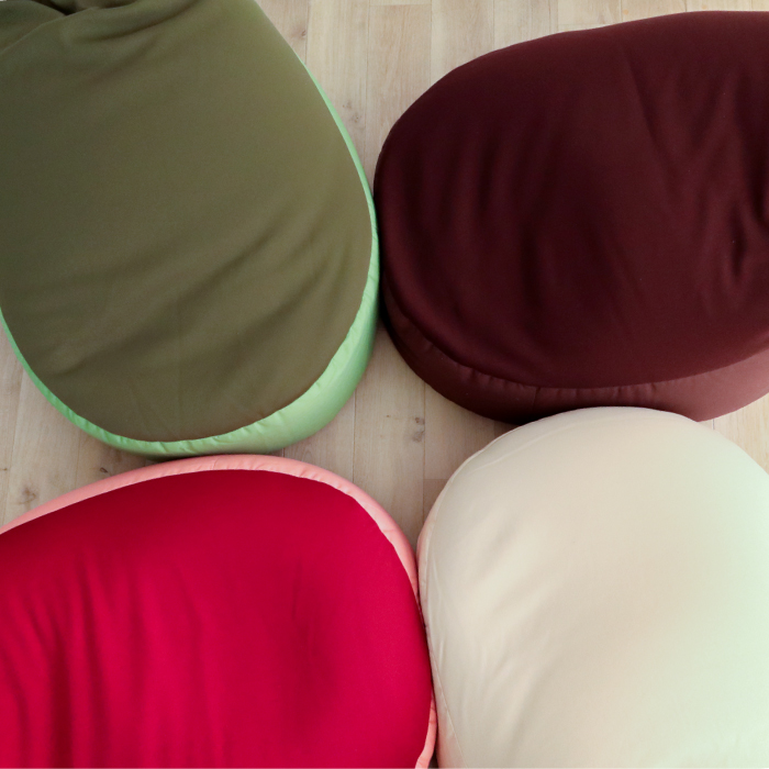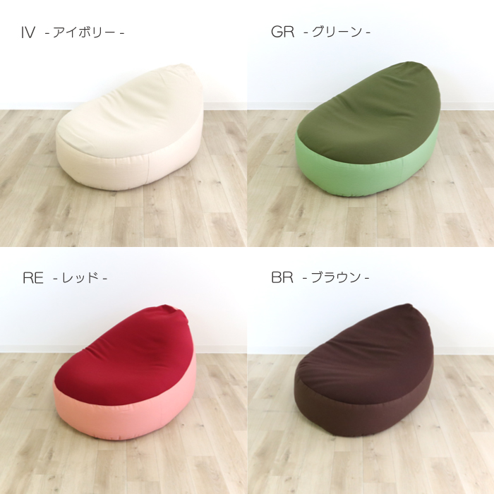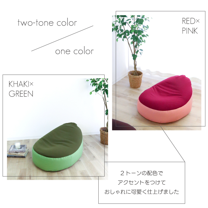 発泡マイクロビーズをたっぷり詰め込んでボリューム満点に仕上げたしずく型ビッグクッションで す。しっかり体を受け止めてリラックスできる大きさです。背もたれとして体をあずけて使ってもいいし、椅子としてドシンと座ることもできます。2トーンの配色でアクセ ントを付けてかわいく仕上げました♪