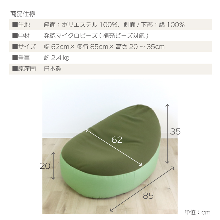 側地:綿100%/ポリエステル100% 中材:発砲ビーズ
