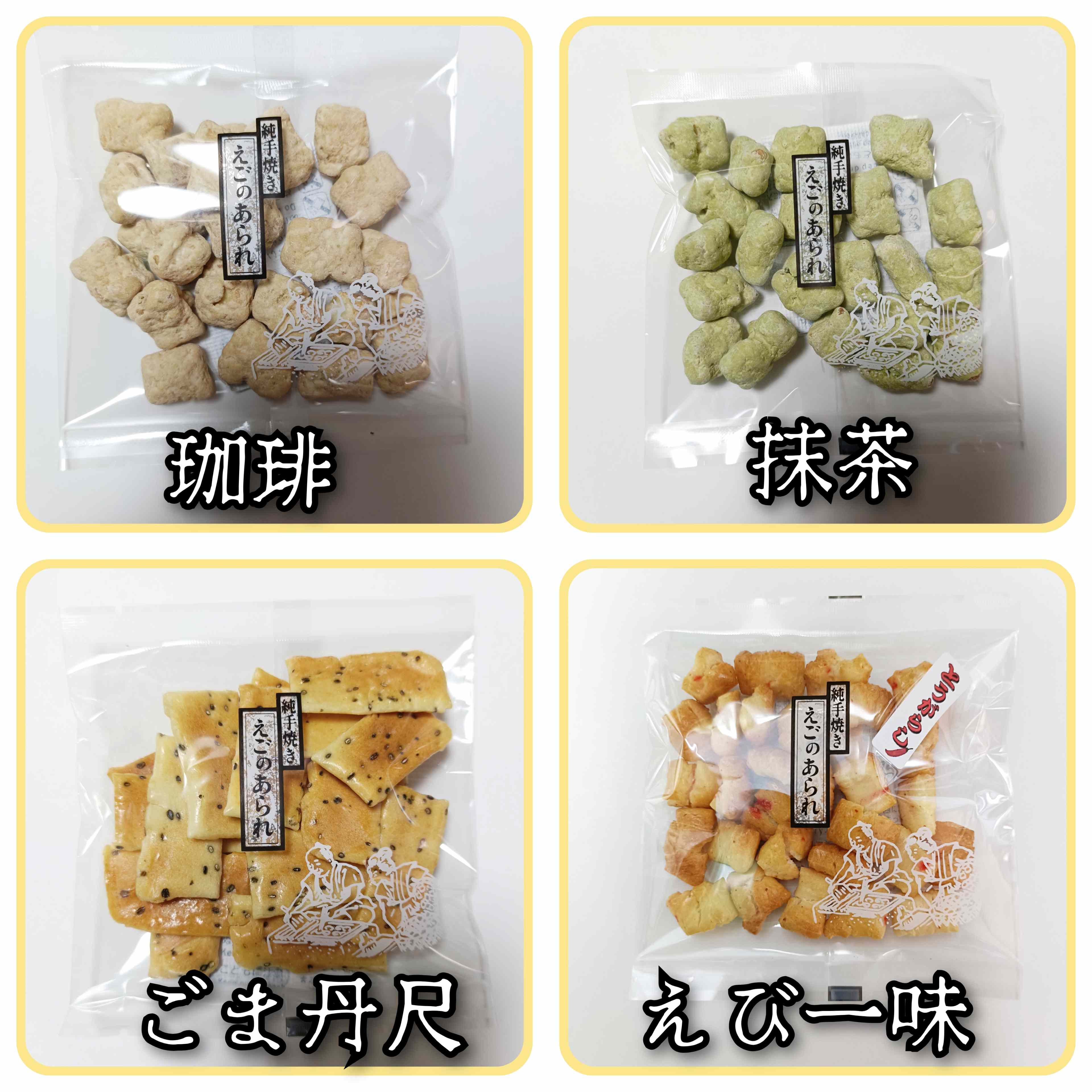 素焼き・醤油味・サラダ味・唐辛子・昆布・桜えび・青海苔・黒ごま・山椒・砂糖・ザラメ・抹茶・うるち米・大豆・黒豆・焼き海苔など