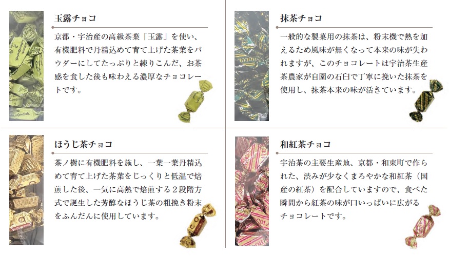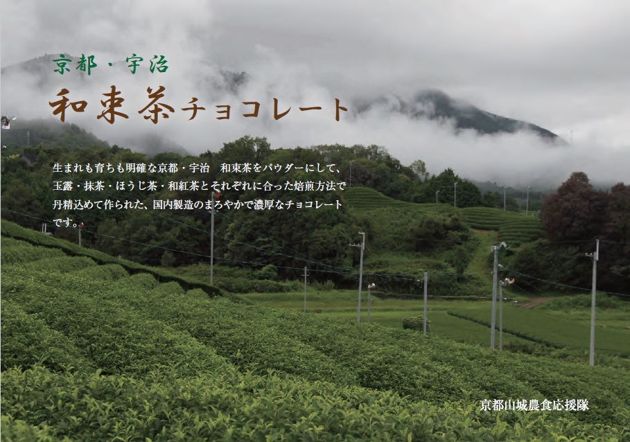 京都府和束町の自園の茶畑で、有機肥料を使い、太陽の光をたっぷりと浴びて、伸び伸びと育てた茶葉のパウダーをふんだんに練り込んだ宇治茶生産製造元茶農家オリジナルレシピのチョコレート。