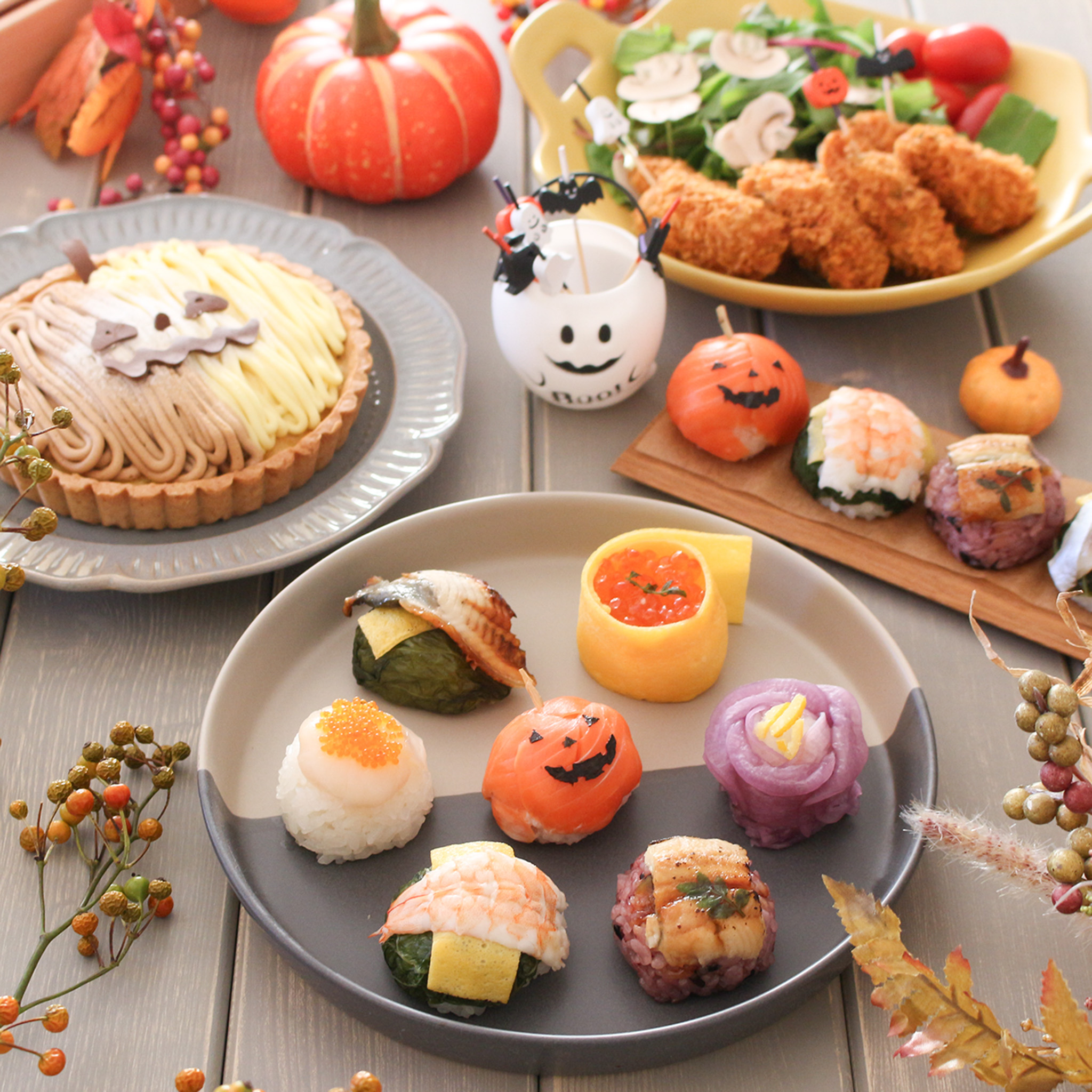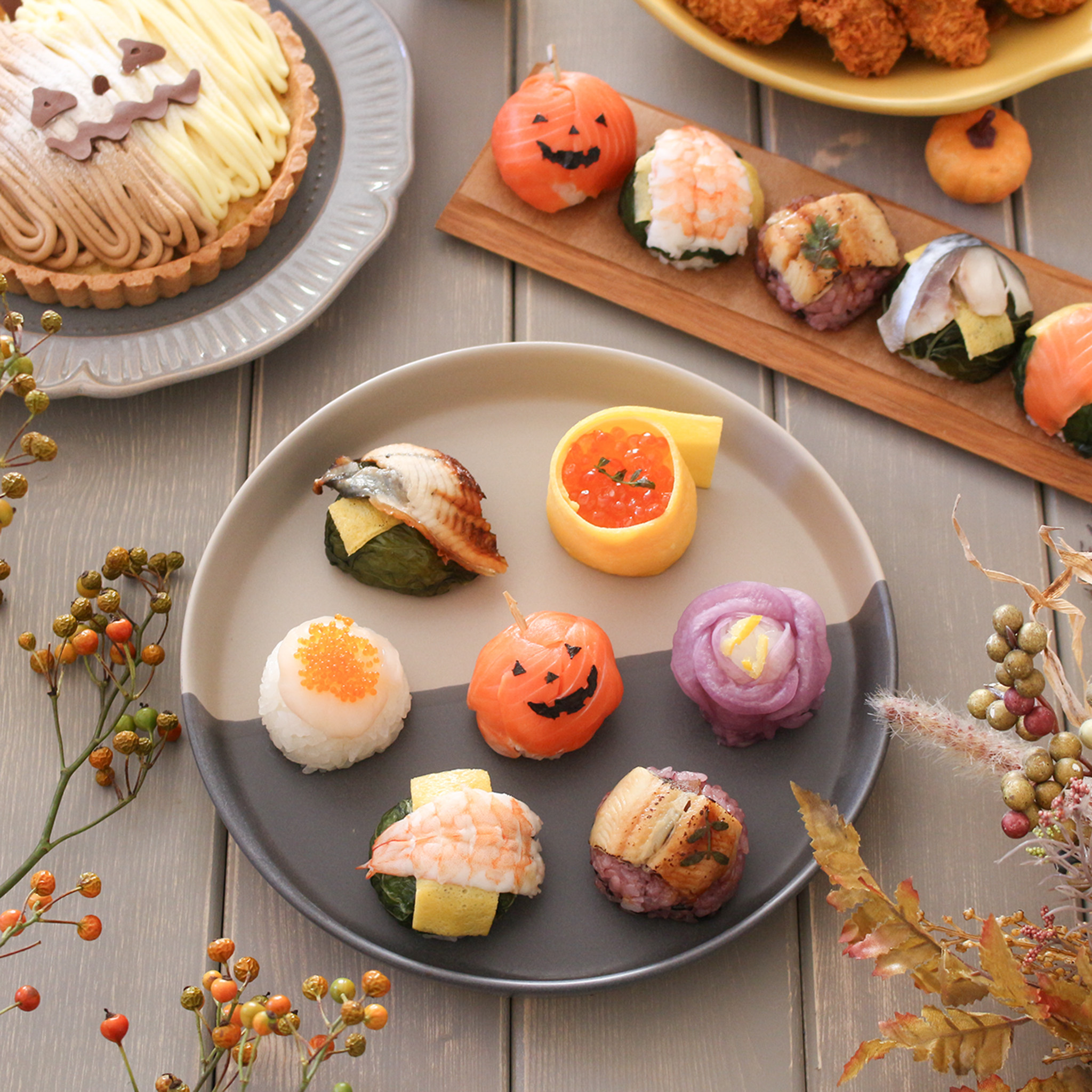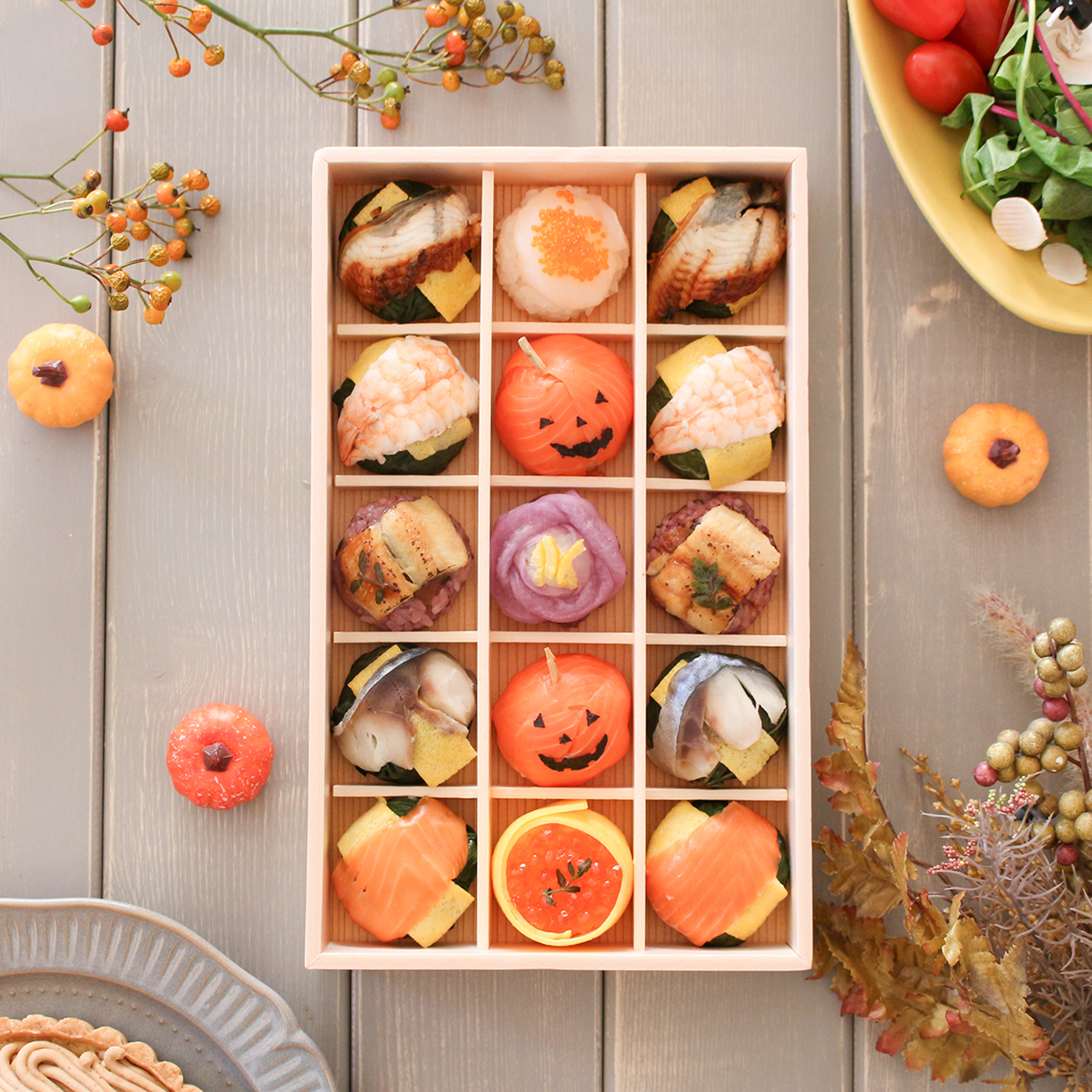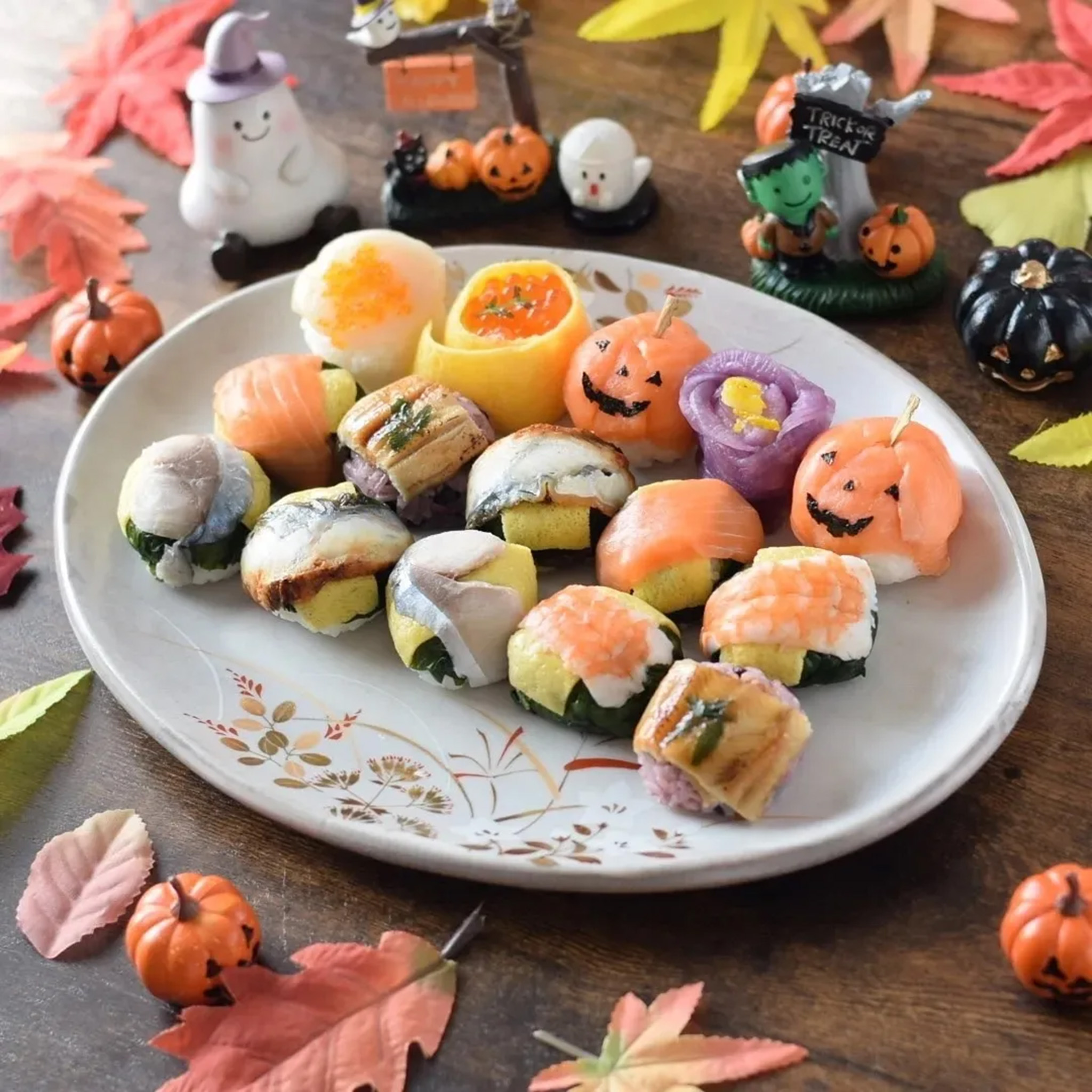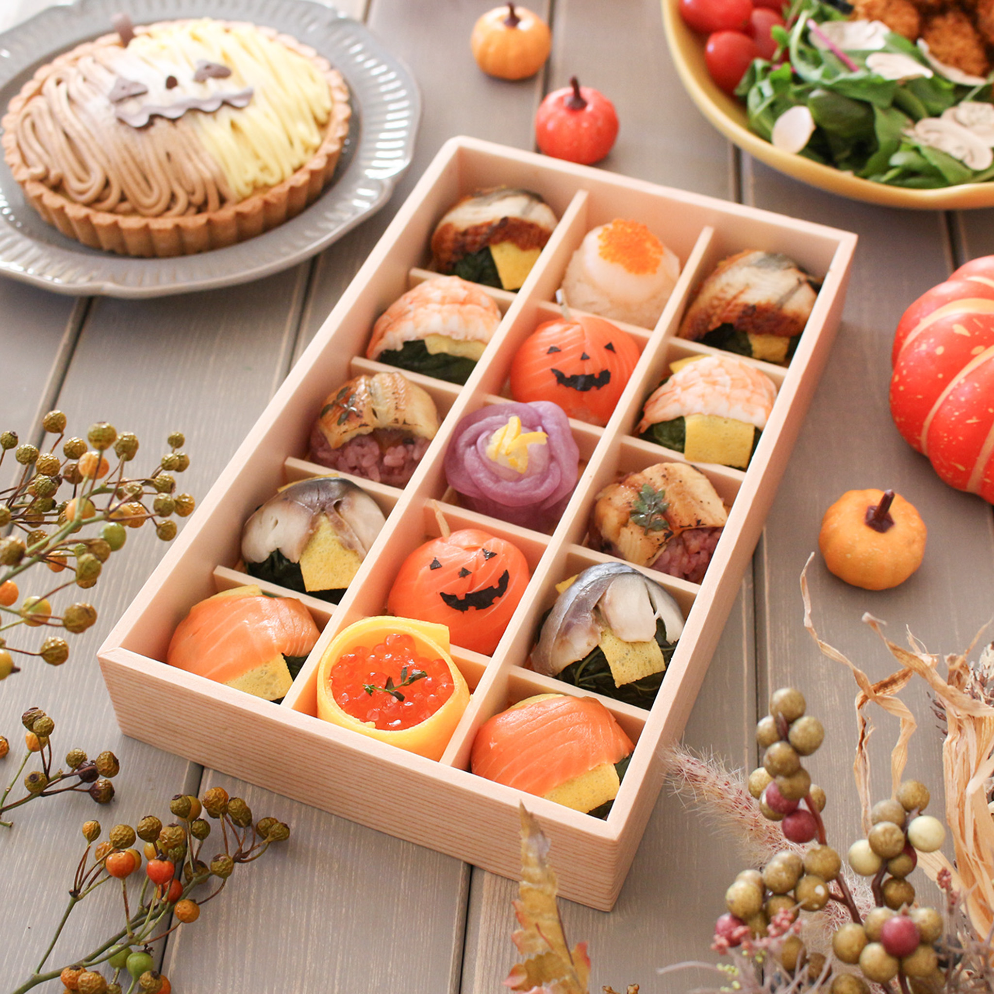 日本ギフト大賞2018ふるさとギフト最高賞の受賞商品の中から、うめもりオリジナルの手鞠寿しが今だけの特別!ハロウィン仕様に大変身!サーモンのジャックオランタンやいくらの手鞠寿し、大粒帆立の手鞠寿しなど・・・