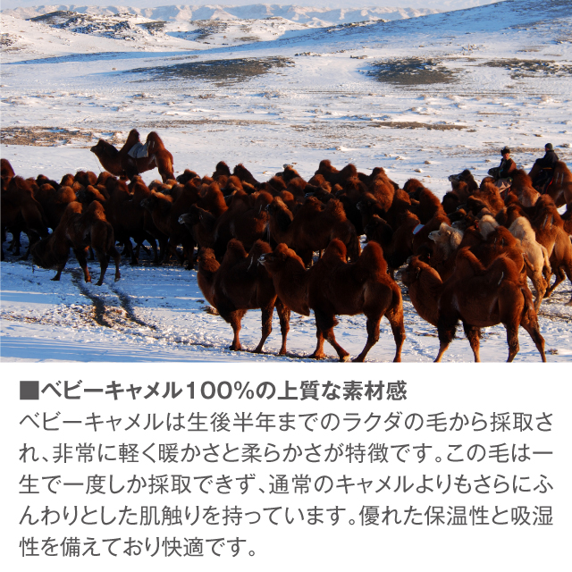 ベビーキャメルウールは生後半年までのラクダの毛から採取され、非常に軽く暖かさと柔らかさが特徴です。