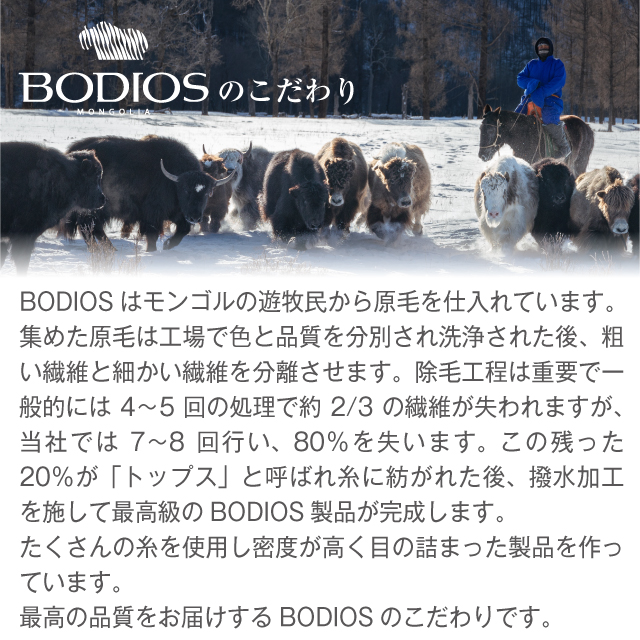 この毛は一生で一度しか採取できず、通常のキャメルウールよりもさらにふんわりとした肌触りを持っています。優れた保温性と吸湿性を備えており快適です。