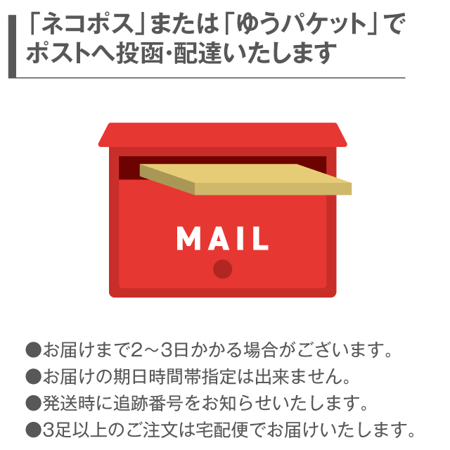 | 配送方法 | ヤマト運輸(【メール便ネコポス】期日時間帯指定不可、お届けまで2~3日かかる場合がございます。ポストへ投函いたします。) |