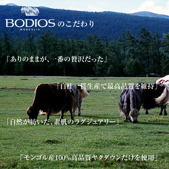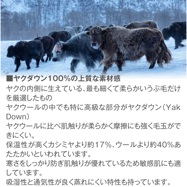 ヤクダウンの細長い繊維は弾力性が強くシワになりにくい特徴があります。