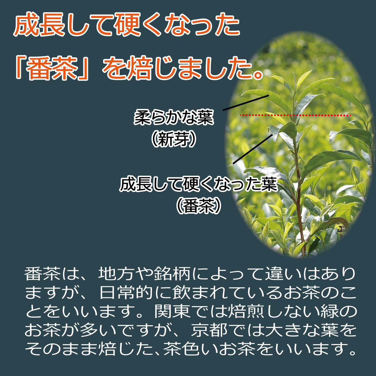 玉露やかぶせ茶を摘み取ったあとに残る番茶を主原料に熱風焙煎で香り高く焙じました。