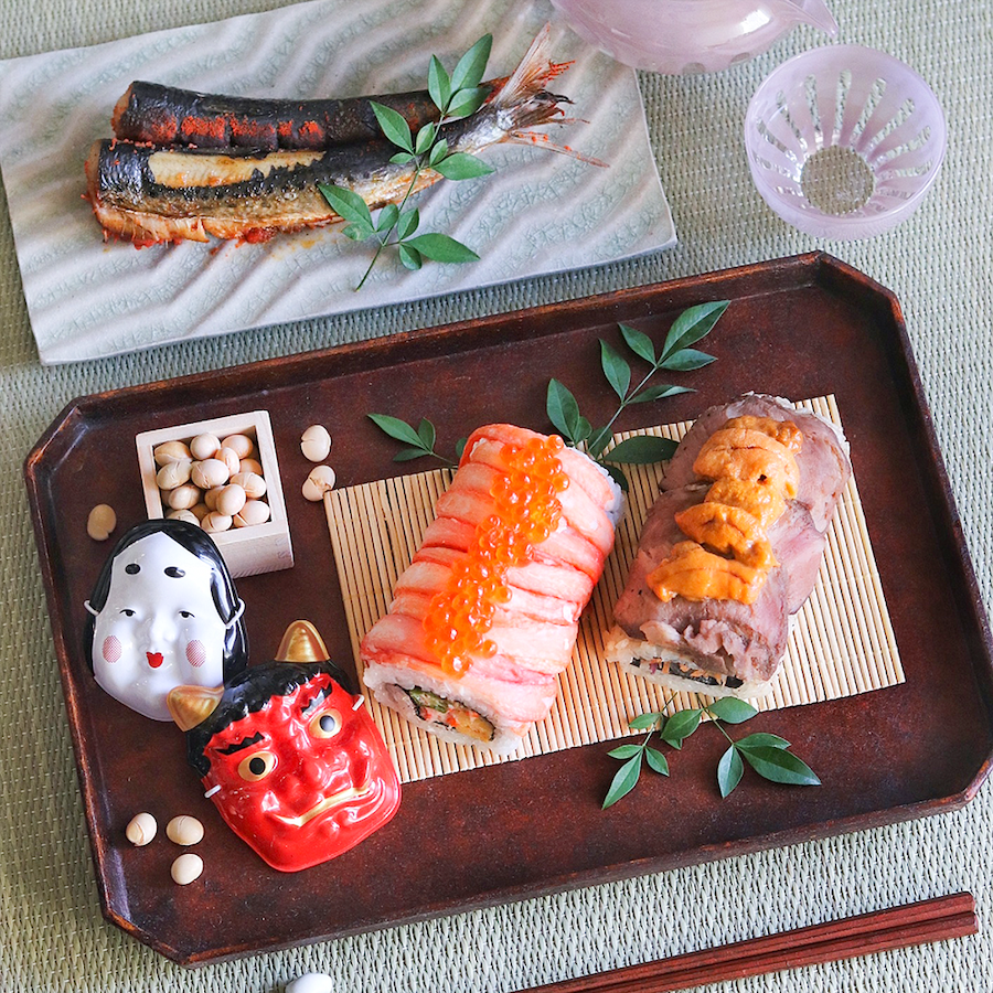 | 商品内容 | ●贅沢黒毛和牛ローストビーフ恵方巻 黒毛和牛ローストビーフ、雲丹、アスパラガス、人参スライス、オニオンスライス ●贅沢紅ずわいがに恵方巻 いくら、紅ずわいがに、カニ味噌ソース、柚子、おくら、玉子、蟹のほぐし身 |