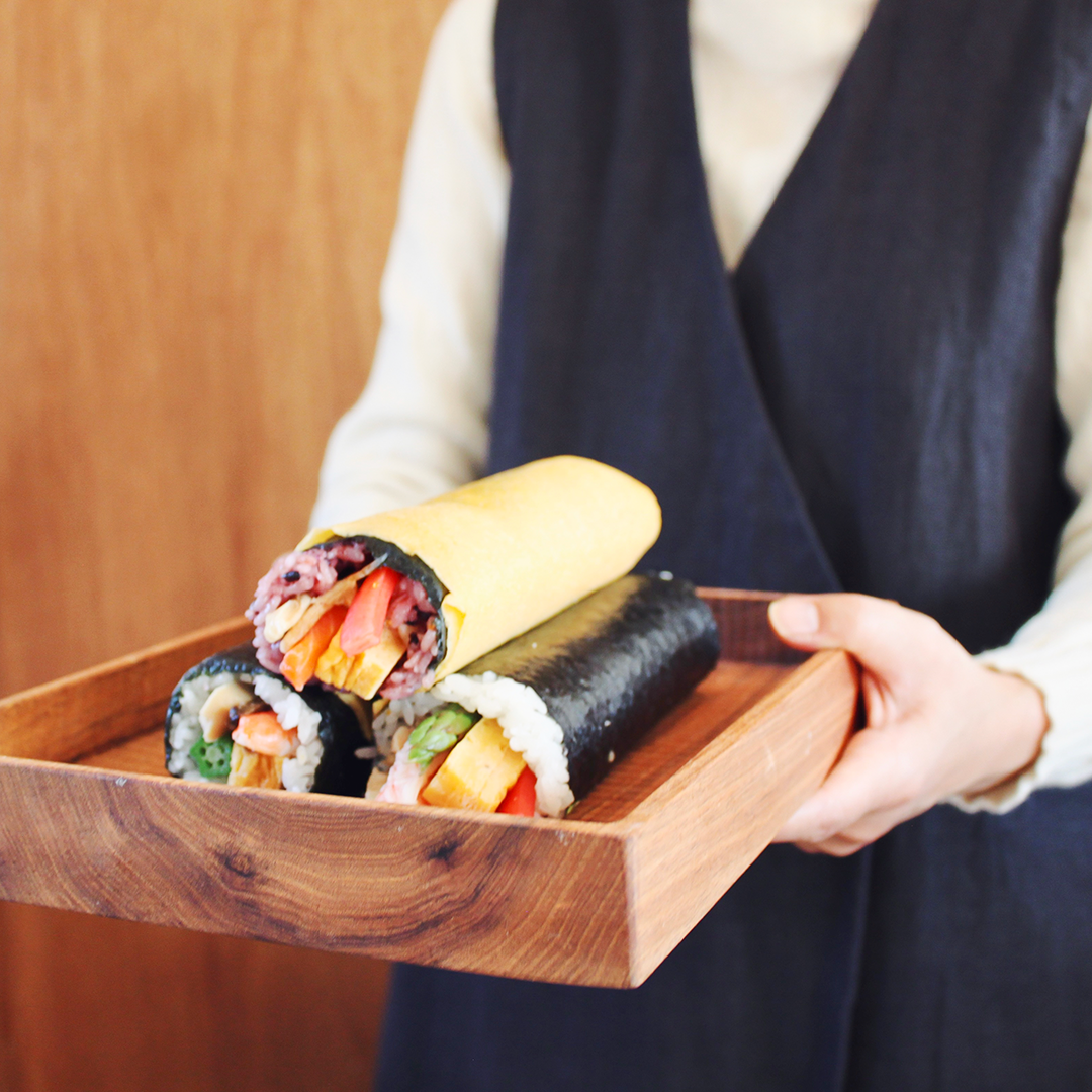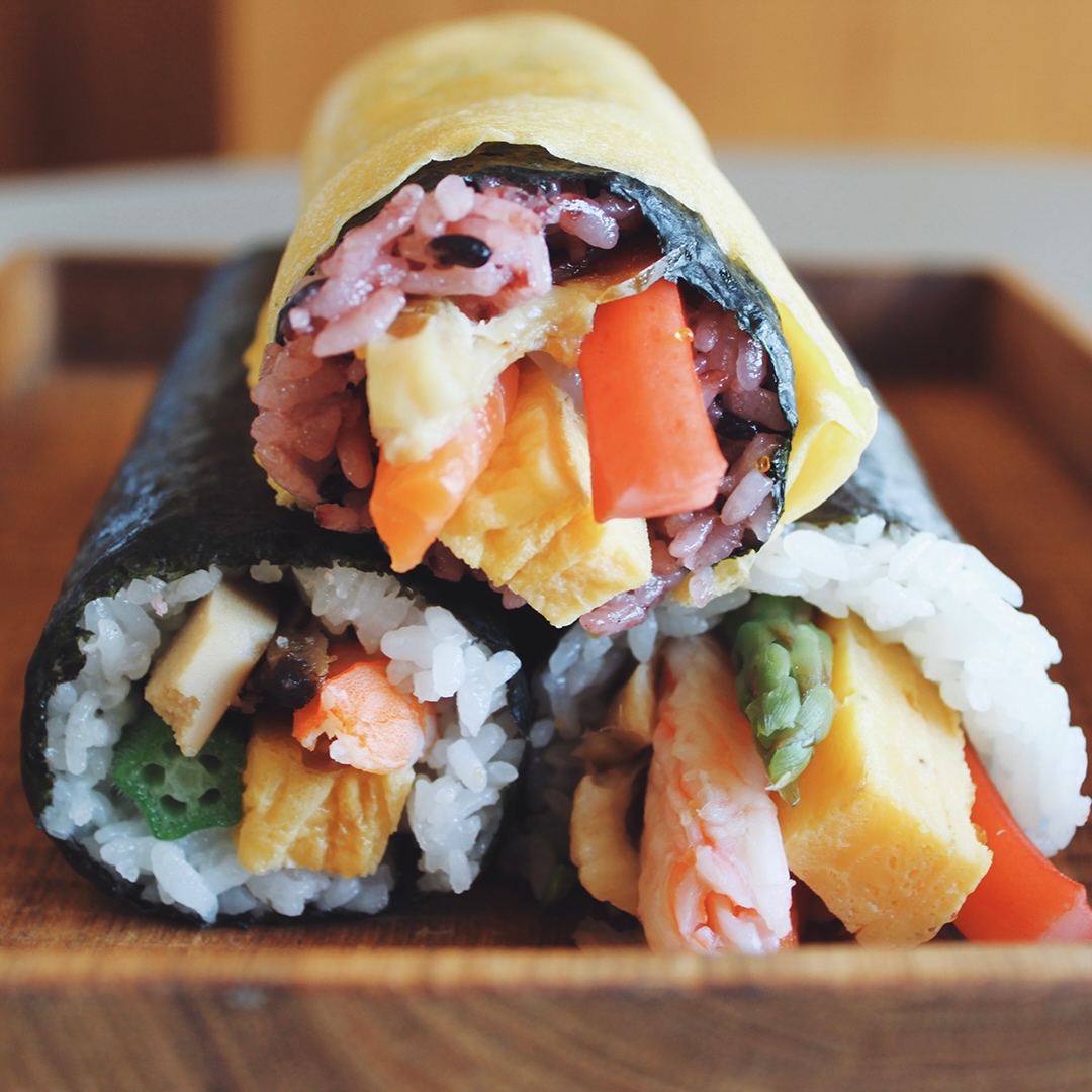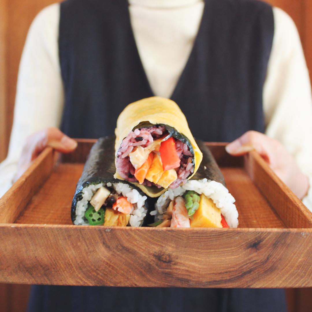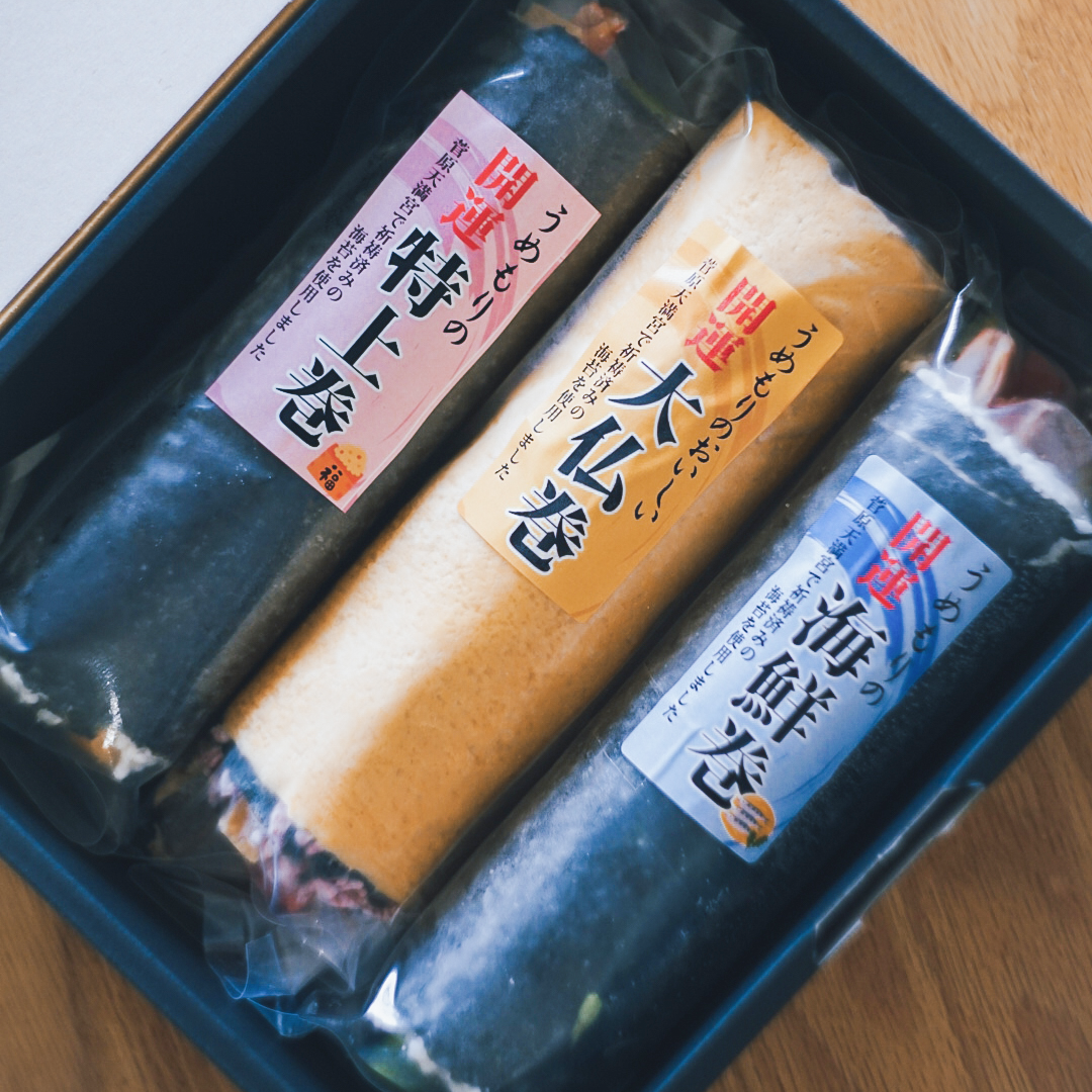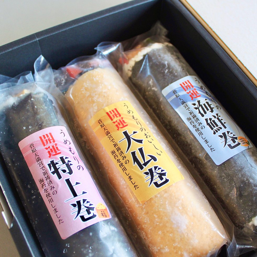 日本最古の天満宮、菅原道真公生誕の地「菅原天満宮」で厄除け開運祈祷済みの縁起の良い海苔を使用した縁起の良い恵方巻です。高野豆腐、干瓢、しいたけなど昔ながらの食材に、海老や穴子など少し贅沢に仕上げた『開運特上巻』もちもちとした食感の紫色の古代米を錦糸卵で巻き上げ、海老やサーモン、奈良漬けを使用したうめもりオリジナルの『古代巻』ふわふわの玉子に海老やサーモン、穴子など、贅沢な食材をふんだんに使用した『開運海鮮巻』のはるよび恵方巻の3本セットをご用意しました。是非お家で楽しめる春を呼び込むお品としてお召し上がりください。