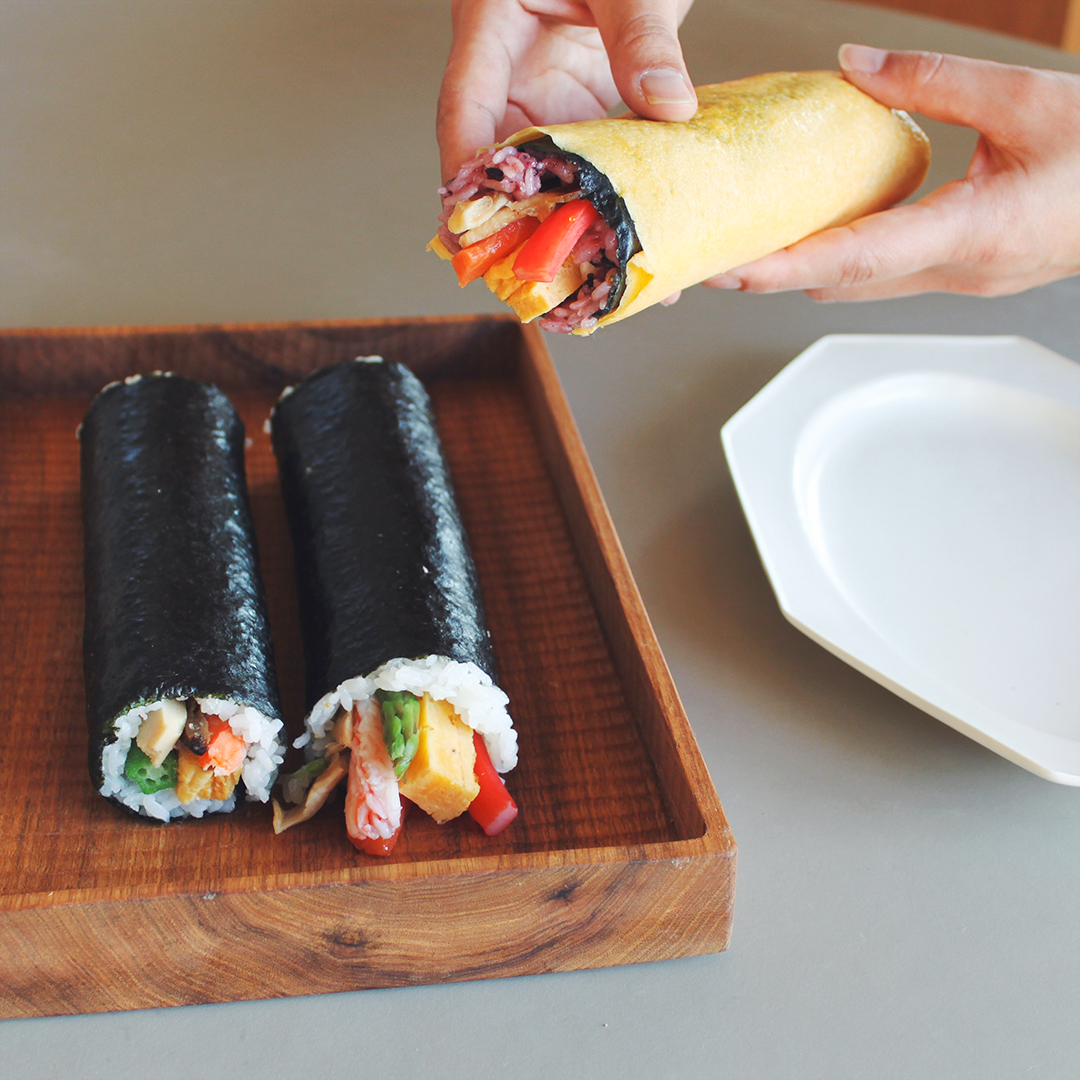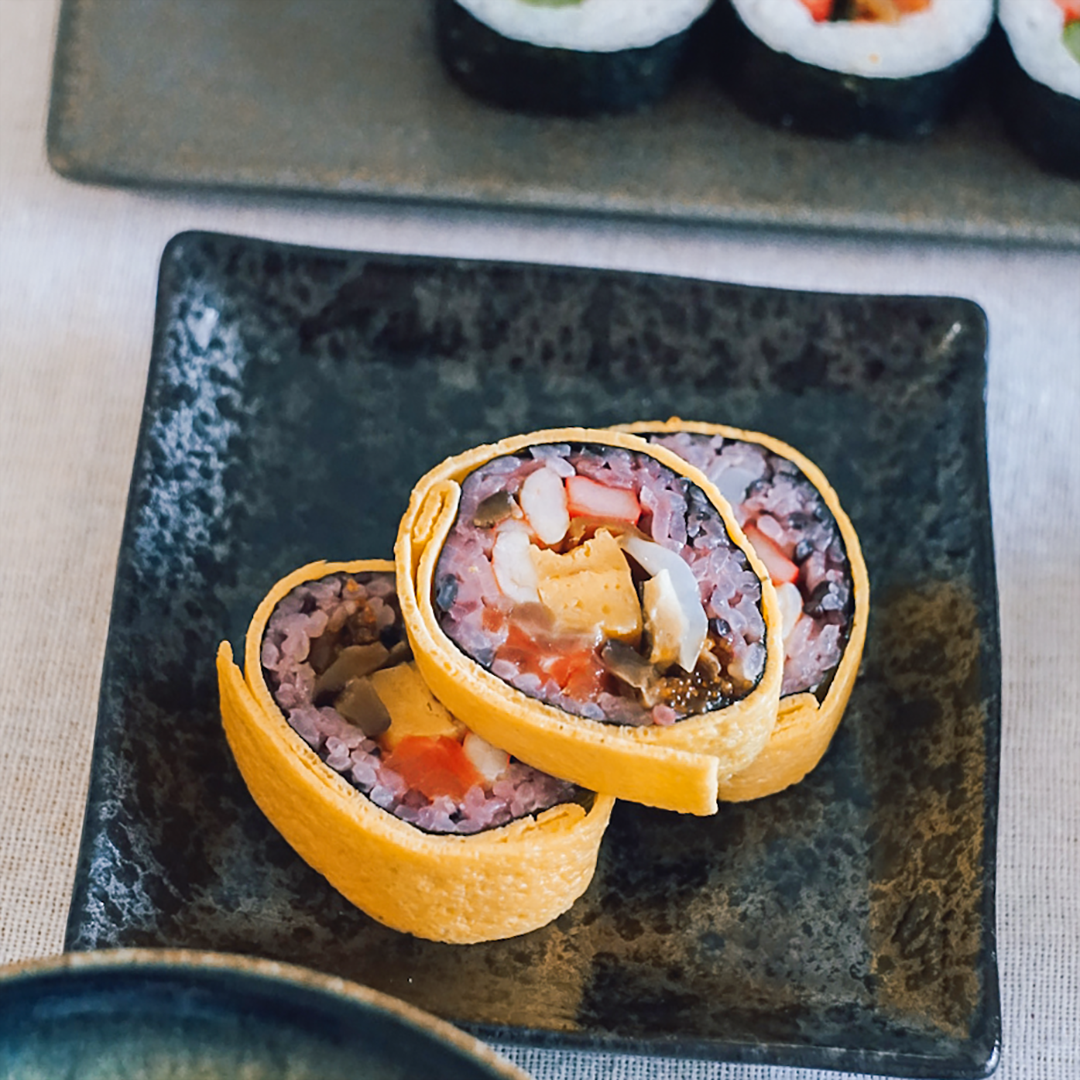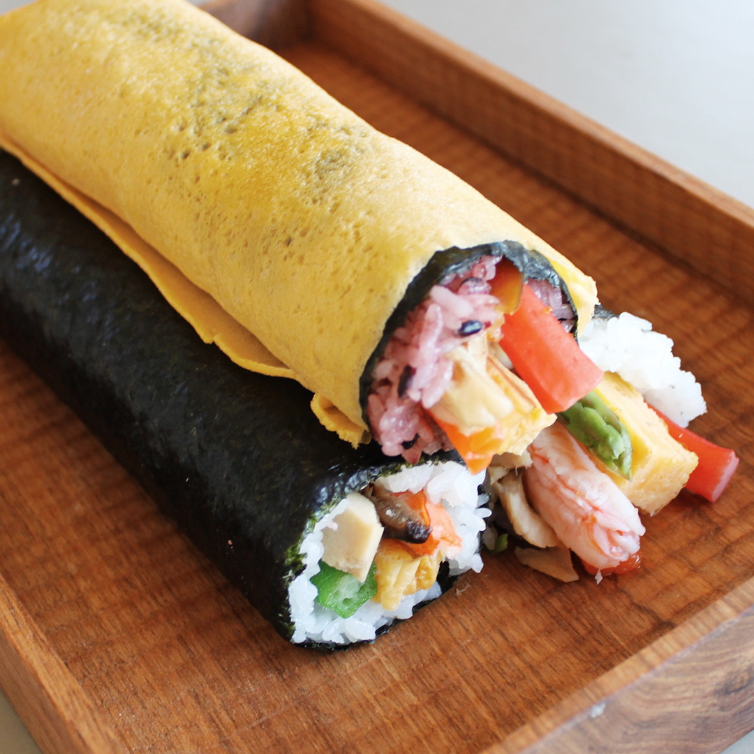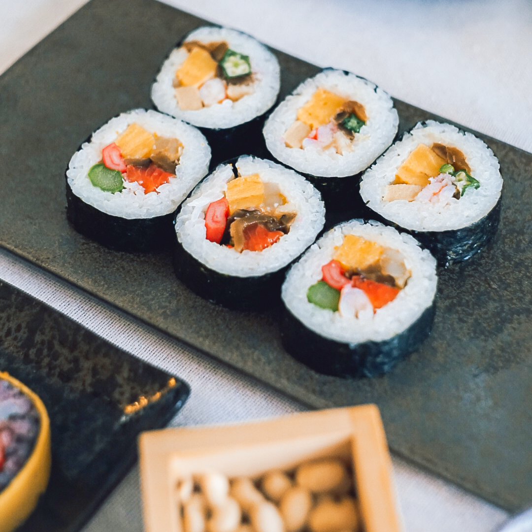 日本最古の天満宮、菅原道真公生誕の地「菅原天満宮」で厄除け開運祈祷済みの縁起の良い海苔を使用した縁起の良い恵方巻です。高野豆腐、干瓢、しいたけなど昔ながらの食材に、海老や穴子など少し贅沢に仕上げた『開運特上巻』もちもちとした食感の紫色の古代米を錦糸卵で巻き上げ、海老やサーモン、奈良漬けを使用したうめもりオリジナルの『古代巻』ふわふわの玉子に海老やサーモン、穴子など、贅沢な食材をふんだんに使用した『開運海鮮巻』のはるよび恵方巻の3本セットをご用意しました。是非お家で楽しめる春を呼び込むお品としてお召し上がりください。