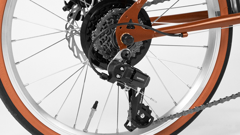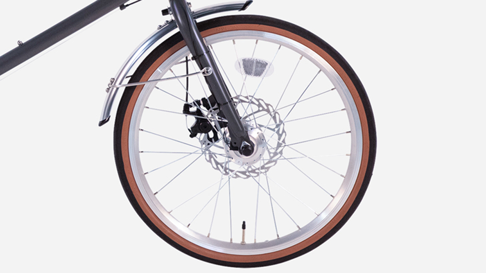 小回りが利く20インチタイヤに、摩擦抵抗を少なくする溝なしのスリックタイヤと太さ1.35のタイヤで漕ぐ軽さを重視しました。