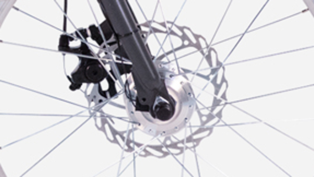 天候に左右されにくく安定した制動力を発揮するブレーキ。通常のブレーキよりタイヤ汚れが少ないのでお手入れも簡単です。