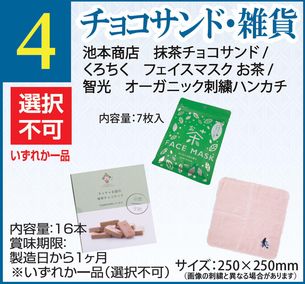 | 商品内容 | 宇治土産集合ギフト お歳暮 商品説明 【茶だんご】※抹茶だんご、いずれか一品。選択不可。 ■宇治川餅本店(うじがわもち) 抹茶だんご 名称:生菓子 原材料名:米粉(国内産)、砂糖、抹茶/トレハロース、増粘剤(グルテン)、(一部に小麦・乳成分・やまいもを含む) 内容量:6本 保存方法:直射日光・高温多湿を避けて保存。開封後は即日のうちに召し上がり下さい。 サイズ:21.5*19*3 賞味期限:6日 ■鮎宗(あいそ)/京都巽庵(きょうとたつみあん) 宇治三昧 名称:生菓子 原材料名:米粉、砂糖、煎茶、抹茶、ほうじ茶/トレハロース 内容量:3本 保存方法:直射日光・高温多湿を避けて保存。開封後は即日のうちに召し上がり下さい。 サイズ:11.5*9*3 賞味期限:6日 【宇治茶】いずれか一品。選択不可。 ■通圓(つうえん) 名称:煎茶 原材料名:緑茶(国産) 内容量:50g 賞味期限:製造日より180日 保存方法:高温多湿を避け、移り香にご注意下さい。 ■宇治 日の出園(うじ ひのでえん) 名称:煎茶 原材料名:緑茶(国産) 内容量:50g 賞味期限:製造日より180日 保存方法:高温多湿を避け、移り香にご注意下さい。 ■吉田銘茶園(よしだめいちゃえん) 名称:煎茶 原材料名:緑茶(国産) 内容量:50g 賞味期限:製造日より180日 保存方法:高温多湿を避け、移り香にご注意下さい。 ■岩井勘蔵商店(いわいかんぞうしょうてん) 名称:煎茶 原材料名:緑茶(国産) 内容量:50g 賞味期限:製造日より180日 保存方法:高温多湿を避け、移り香にご注意下さい。 【ちりめん山椒 or こいくち醤油】※ちりめん山椒 or こいくち醤油、いずれか一品。選択不可。 ■清水醤油醸造元(しみずしょうゆじょうぞうもと)/こいくち醤油 名称:こいくちしょうゆ(混合) 原材料名:アミノ酸液(国内製造)、食塩、脱脂加大豆(遺伝子組換えではない)、小麦、砂糖、甘味料(ステビア)、カラメル色素、VB1 内容量:150ml 保存方法:直射日光・高温多湿を避けて常温保存 賞味期限:12か月 ■大家(おおや)/ちりめん山椒 名称:ちりめん山椒(佃煮) 原材料名:ぎんぽ、醤油、砂糖、水飴、山椒、酒、味醂、米酢、寒天/ソルビット、調味料(アミノ酸等)、保存料(ソルビン酸K)(一部に小麦、大豆を含む) 内容量:40g 保存方法:直射日光・高温多湿を避けて保存 賞味期限:60日 【抹茶菓子・雑貨】※チョコサンド or フェイスマスク or ハンカチ、いずれか一品。選択不可。 ■櫟 池本商店(くぬぎ いけもとしょうてん)/チョコサンド 名称:焼菓子 原材料名:小麦粉、三温糖、食用精製加工油脂、砂糖、ホワイトチョコレート、鶏卵、牛乳、アーモンドペースト、全脂粉乳、宇治抹茶粉末、植物油脂、ヘーゼルナッツ粉末、食塩、膨張剤、乳化剤、香料、着色料(カロテン)(原材料の一部に大豆を含む) 内容量:16本 保存方法:直射日光・高温多湿を避けて保存 賞味期限:製造日から1ケ月 ■くろちく(くろちく) 名称:フェイスマスク 内容量:7枚入り パッケージサイズ:195*140mm ■智光(ちこう) 名称:オーガニック刺繍ハンカチ 内容量:1枚 サイズ:250*250mm 【雑貨】※ミニ畳 or 和風ポストカード、いずれか一品。選択不可。 ■もりおか畳店(もりおかたたみてん) 名称:ミニ畳 内容量:1個 サイズ:100*160mm ※柄はランダムとなります。 ■陽気工房(ようきこうぼう) 名称:和風ポストカード 内容量:1枚 サイズ:100*148mm 【和洋菓子】※抹茶栗パイ or八つ橋(抹茶)、いずれか一品。選択不可。 ■総本家 大茶萬(そうほんけ おちゃまん)/抹茶栗パイ 名称:焼菓子 原材料名:渋皮栗・白生餡・砂糖・抹茶・小麦粉(国内製造)・マーガリン(乳成分を含む)・卵・塩/乳化剤(大豆由来)香料 内容量:1個 保存方法:直射日光・高温多湿を避けて保存。 賞味期限:6日 ■井筒八ッ橋本舗(いづつやつはしほんぽ) /粒あん入り生八ッ橋 夕子(抹茶) 名称:あん入り生八ッ橋 原材料名:小倉あん(砂糖、小倉、寒天)(国内製造)、米粉、砂糖、きな粉、抹茶/トレハロース、着色料(クチナシ色素、紅花色素)、酵素、(一部に大豆を含む) 内容量:5個 保存方法:直射日光・高温多湿を避けて保存。 賞味期限:15日 【宇治茶ペットボトル】 ■樋口鉱泉 原材料 緑茶(煎茶・碾茶)、ビタミンC 内容量:500ml 保存方法:直射日光・高温多湿を避けて保存。 賞味期限:2025年6月5日 【抹茶バームクーヘン】 ■山崎製パン 名称:カステラ 原材料名:小麦粉(国内製造)、卵、砂糖、卵白、砂糖調製品(砂糖)、ショートニング、でん粉、水あめ、マーガリン、乳化油脂、大豆粉、抹茶、バター、食塩/ソルビット、乳化剤、膨脹剤、着色料(クチナシ、カロテノイド、フラボノイド)、香料、V.C、(一部に乳成分・卵・小麦・大豆を含む) 内容量:1個 保存方法:直射日光・高温多湿を避けて保存 賞味期限:製造日から10日 【抹茶菓子】※宇治煎餅抹茶or宇治どら焼き、いずれか一品。選択不可。 ■京鹿六せんべい本舗(きょうかろくせんべいほんぽ) 名称:米菓 原材料名:うるち米(国産)、砂糖、卵白、抹茶、食塩(一部に卵を含む) 内容量:80g 保存方法:直射日光・高温多湿を避けて保存 賞味期限:150日 ■林屋久太郎商店 宇治どら焼き 原材料名:粒餡(小豆、砂糖