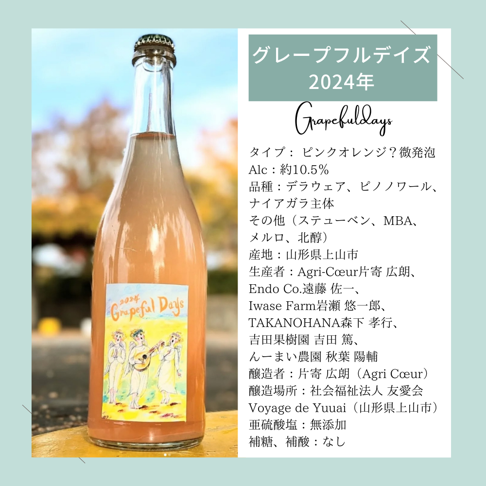 今年のグレープフルデイズは、上山市産のデラウェア・ピノ・ノワール・ナイアガラを5:4:1で使用し、マセラシオン・カルボニックで仕込みました。