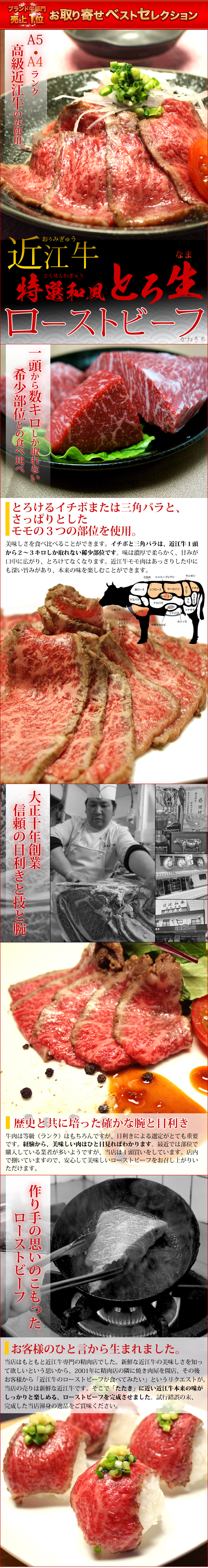 一頭から数キロしか取れない希少部位(とろけるイチボまたは三角バラとさっぱりとしたモモ)で作られた近江牛特選和風とろ生ローストビーフ。当店の売りである「新鮮な近江牛の美味しさを知ってほしい」との思いから、『たたき』に近い近江牛本来の味を楽しめるローストビーフになっております。お求めやすいご自宅用パック。