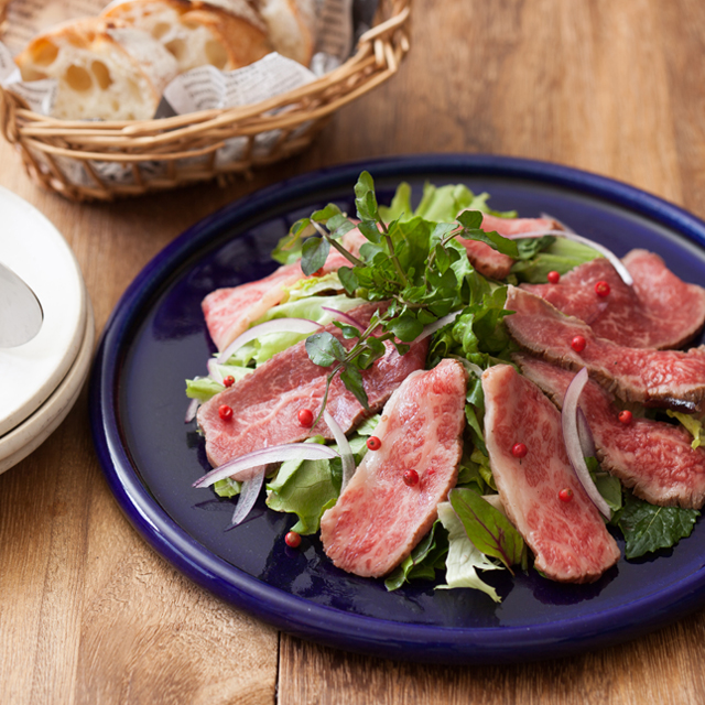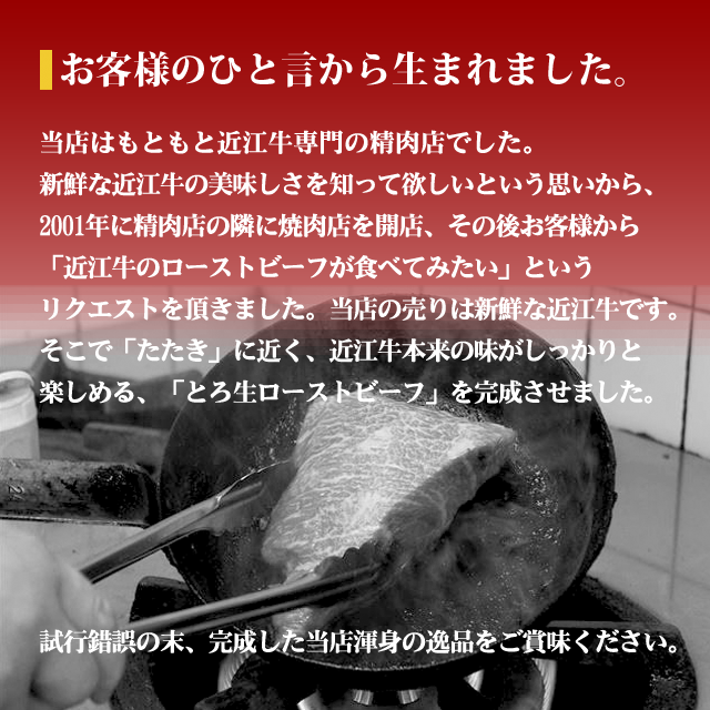 当店のローストビーフは「たたき(生食)」に近い商品です。一般的に食肉の生食には食中毒のリスクがあります。生食用の牛肉を使用していますが、お子さんやご年配の方など、食中毒に対する抵抗力が弱い方は生食をお控えください。