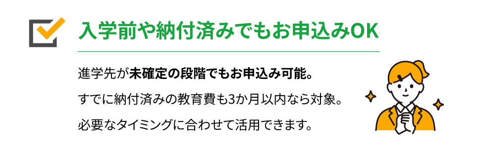 受験前、学校が決まる前、必要な金額が確定する前でもお申込み可能です。