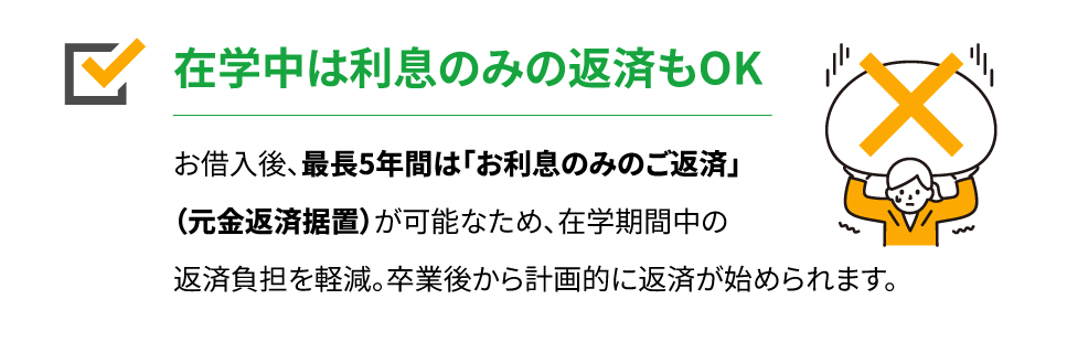 お借入当初5年間を上限(1か月単位)として、お利息のみのご返済(元金部分のご返済を据え置き)とすることが可能です。