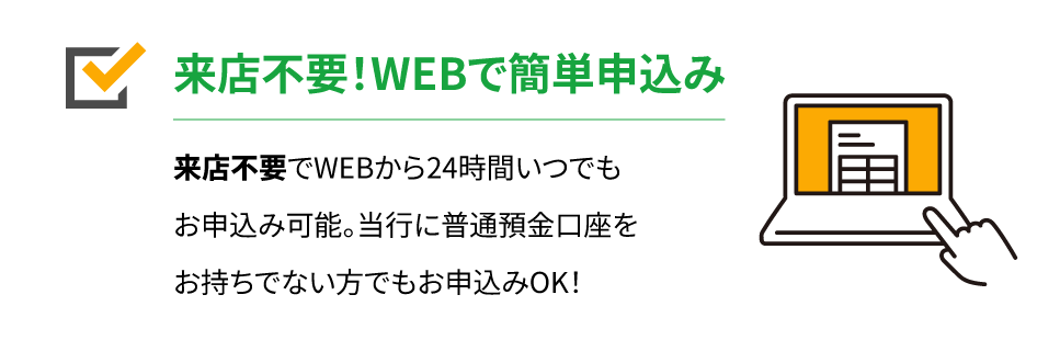 当行に普通預金口座をお持ちでないお客さまもお申込みいただけます。※正式審査のお申込み時までに、普通預金口座の開設が必要となります。